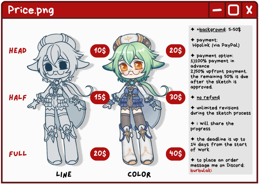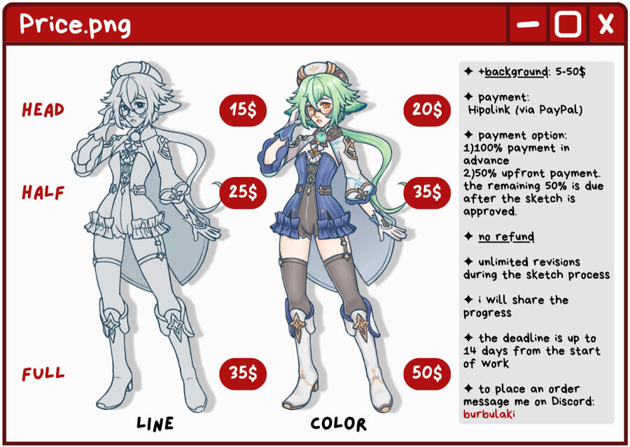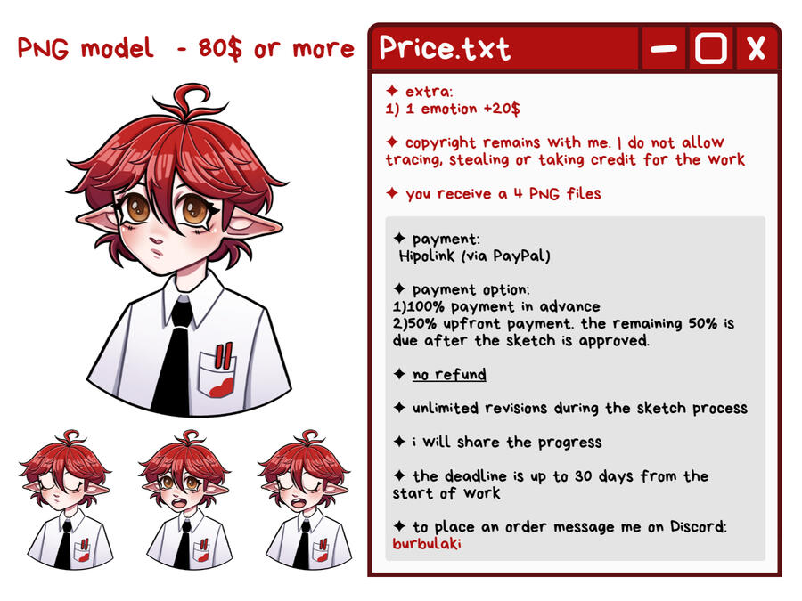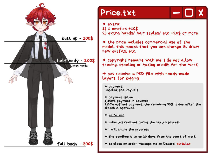 ✦ I draw exclusively in my own style and in no other, so please don't ask me to copy someone else's style.✦ I reserve the right to refuse your commission without giving any reason.✦ If you want me not to publish your work on Twitter and other social networks or to publish it after your debut (in this case no additional payment is required), notify me at the approval stage.✦ I am prohibited from reselling your work or using it for any other improper purpose.✦ I accept orders only through Hipolink, Boosty (via PayPal).✦ To register you in the queue, I take a 50% prepayment. The advance payment is not refundable if you want to cancel the order. I understand that life problems happen and your prepayment will not be lost. In this case, I will offer to move you in waitlist until we can continue ordering.✦ Unlimited revisions during the sketch process.✦ Please be patient, the delivery time of the commission may depend on my health condition or the number of orders.✦ Prices are subject to change.✦ Please let me know if you change your Discord name (if you don't let me know, I won't be able to find you because I have a lot of chats)!✦ I am not responsible for the fact that your commission was rejected by "Twitch" or any other platform, so make sure that your request complies with the recommendations of the preferred platform.✦ Feel free to ask about the progress of your commission at any time. I will always do my best to complete your assignment as soon as possible, but please be patient and don't rush me so that I can provide you with quality artwork.WHEN YOU ASK FOR A COMMISSION YOU ARE ACCEPTING ALL THE TERMS ABOVE!