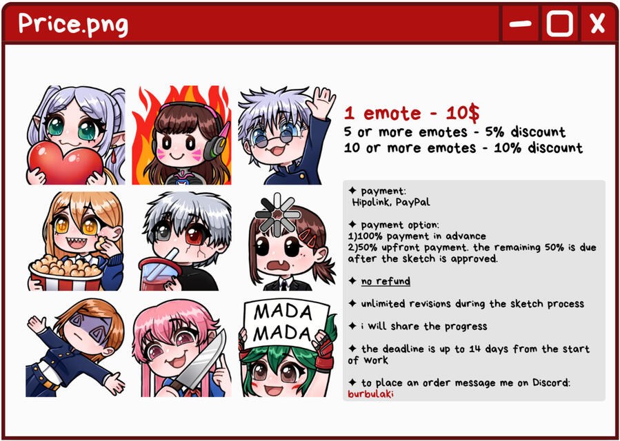 I create emotes and Twitch channel designs.You can order custom emotes or buy ready-made emotes in my shop. I also do 2D PNG or Vtuber model, Twitch designs like panels, avatars, sub badges, or just cool art in my own style.