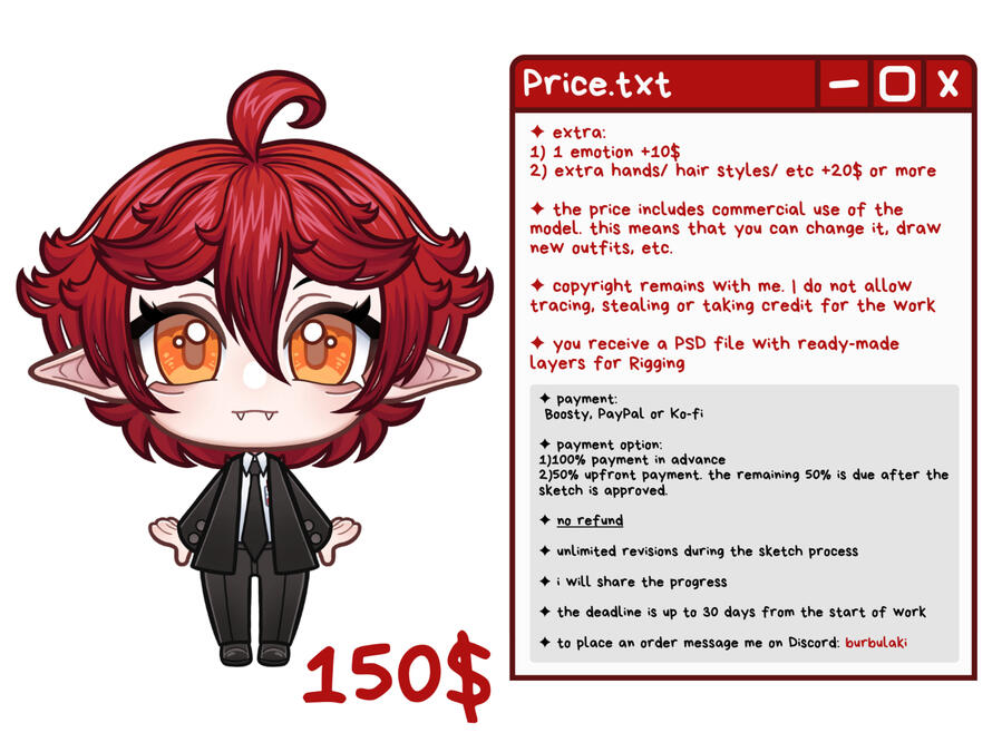 ✦ I draw exclusively in my own style and in no other, so please don't ask me to copy someone else's style.✦ I reserve the right to refuse your commission without giving any reason.✦ If you want me not to publish your work on Twitter and other social networks or to publish it after your debut (in this case no additional payment is required), notify me at the approval stage.✦ I am prohibited from reselling your work or using it for any other improper purpose.✦ I accept orders only through Hipolink, Boosty (via PayPal).✦ To register you in the queue, I take a 50% prepayment. The advance payment is not refundable if you want to cancel the order. I understand that life problems happen and your prepayment will not be lost. In this case, I will offer to move you in waitlist until we can continue ordering.✦ Unlimited revisions during the sketch process.✦ Please be patient, the delivery time of the commission may depend on my health condition or the number of orders.✦ Prices are subject to change.✦ Please let me know if you change your Discord name (if you don't let me know, I won't be able to find you because I have a lot of chats)!✦ I am not responsible for the fact that your commission was rejected by "Twitch" or any other platform, so make sure that your request complies with the recommendations of the preferred platform.✦ Feel free to ask about the progress of your commission at any time. I will always do my best to complete your assignment as soon as possible, but please be patient and don't rush me so that I can provide you with quality artwork.WHEN YOU ASK FOR A COMMISSION YOU ARE ACCEPTING ALL THE TERMS ABOVE!